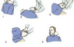 Из длинной полоски ткани можно изготовить пращевидную повязку, сделав на ней продольные разрезы с двух сторон и оставив лишь небольшой «кармашек» в середине. В «кармашек» помещают подбородок, нижние завязки фиксируют на темени, верхние – на затылке.
